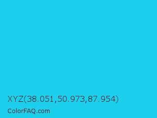 XYZ 38.051,50.973,87.954 Color is a normal cyan color and the nearest color is Spiro Disco Ball #0fc0fc. Hex code #1bcfed and RGB value is rgb(27,207,237). In RGB color space, this color is composed of 11% red, 81% green, 93% blue, In CMYK color space, this color is composed of 89% cyan, 13% magenta, 0% yellow , 7% black , In HSL color space, this color has a hue angle of 189° , 85% saturation and 52% lightness.