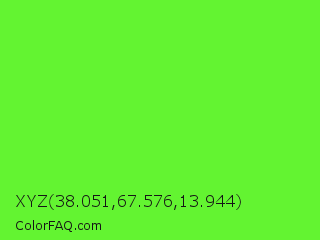 XYZ 38.051,67.576,13.944 Color is a normal green color and the nearest color is Spring Frost #87ff2a. Hex code #63f431 and RGB value is rgb(99,244,49). In RGB color space, this color is composed of 39% red, 96% green, 19% blue, In CMYK color space, this color is composed of 59% cyan, 0% magenta, 80% yellow , 4% black , In HSL color space, this color has a hue angle of 105° , 90% saturation and 57% lightness.