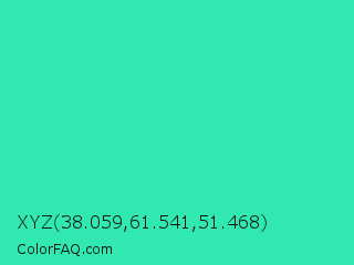 XYZ 38.059,61.541,51.468 Color is a normal green color and the nearest color is Eucalyptus #44d7a8. Hex code #31e8b1 and RGB value is rgb(49,232,177). In RGB color space, this color is composed of 19% red, 91% green, 69% blue, In CMYK color space, this color is composed of 79% cyan, 0% magenta, 24% yellow , 9% black , In HSL color space, this color has a hue angle of 162° , 80% saturation and 55% lightness.