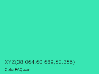 XYZ 38.064,60.689,52.356 Color is a normal green color and the nearest color is Eucalyptus #44d7a8. Hex code #38e6b3 and RGB value is rgb(56,230,179). In RGB color space, this color is composed of 22% red, 90% green, 70% blue, In CMYK color space, this color is composed of 76% cyan, 0% magenta, 22% yellow , 10% black , In HSL color space, this color has a hue angle of 162° , 78% saturation and 56% lightness.