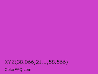 XYZ 38.066,21.1,58.566 Color is a normal magenta color and the nearest color is Steel Pink #cc33cc. Hex code #ce40cb and RGB value is rgb(206,64,203). In RGB color space, this color is composed of 81% red, 25% green, 80% blue, In CMYK color space, this color is composed of 0% cyan, 69% magenta, 1% yellow , 19% black , In HSL color space, this color has a hue angle of 301° , 59% saturation and 53% lightness.