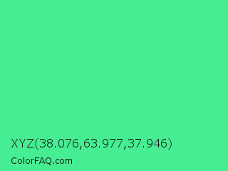 XYZ 38.076,63.977,37.946 Color is a normal green color and the nearest color is Eucalyptus #44d7a8. Hex code #46ed93 and RGB value is rgb(70,237,147). In RGB color space, this color is composed of 27% red, 93% green, 58% blue, In CMYK color space, this color is composed of 70% cyan, 0% magenta, 38% yellow , 7% black , In HSL color space, this color has a hue angle of 148° , 82% saturation and 60% lightness.
