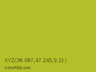 XYZ 38.087,47.245,9.21 Color is a normal yellow color and the nearest color is Acid Green #b0bf1a. Hex code #b5bf29 and RGB value is rgb(181,191,41). In RGB color space, this color is composed of 71% red, 75% green, 16% blue, In CMYK color space, this color is composed of 5% cyan, 0% magenta, 79% yellow , 25% black , In HSL color space, this color has a hue angle of 64° , 65% saturation and 45% lightness.