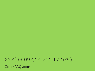 XYZ 38.092,54.761,17.579 Color is a normal green color and the nearest color is Conifer #acdd4d. Hex code #96d557 and RGB value is rgb(150,213,87). In RGB color space, this color is composed of 59% red, 84% green, 34% blue, In CMYK color space, this color is composed of 30% cyan, 0% magenta, 59% yellow , 16% black , In HSL color space, this color has a hue angle of 90° , 60% saturation and 59% lightness.