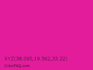 XYZ 38.095,19.562,33.22 Color is a normal magenta color and the nearest color is Barbie Pink #e0218a. Hex code #e31c9c and RGB value is rgb(227,28,156). In RGB color space, this color is composed of 89% red, 11% green, 61% blue, In CMYK color space, this color is composed of 0% cyan, 88% magenta, 31% yellow , 11% black , In HSL color space, this color has a hue angle of 321° , 78% saturation and 50% lightness.