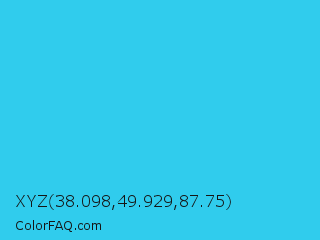 XYZ 38.098,49.929,87.75 Color is a normal cyan color and the nearest color is Scooter #2ebfd4. Hex code #30cced and RGB value is rgb(48,204,237). In RGB color space, this color is composed of 19% red, 80% green, 93% blue, In CMYK color space, this color is composed of 80% cyan, 14% magenta, 0% yellow , 7% black , In HSL color space, this color has a hue angle of 190° , 84% saturation and 56% lightness.