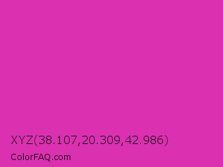 XYZ 38.107,20.309,42.986 Color is a normal magenta color and the nearest color is Frostbite #e936a7. Hex code #db30b0 and RGB value is rgb(219,48,176). In RGB color space, this color is composed of 86% red, 19% green, 69% blue, In CMYK color space, this color is composed of 0% cyan, 78% magenta, 20% yellow , 14% black , In HSL color space, this color has a hue angle of 315° , 70% saturation and 52% lightness.