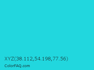 XYZ 38.112,54.198,77.56 Color is a normal cyan color and the nearest color is Turquoise PWG #30d5c8. Hex code #21d7de and RGB value is rgb(33,215,222). In RGB color space, this color is composed of 13% red, 84% green, 87% blue, In CMYK color space, this color is composed of 85% cyan, 3% magenta, 0% yellow , 13% black , In HSL color space, this color has a hue angle of 182° , 74% saturation and 50% lightness.