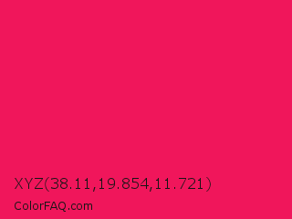 XYZ 38.11,19.854,11.721 Color is a normal rose color and the nearest color is Razzmatazz Crayola #e30b5c. Hex code #f0165b and RGB value is rgb(240,22,91). In RGB color space, this color is composed of 94% red, 9% green, 36% blue, In CMYK color space, this color is composed of 0% cyan, 91% magenta, 62% yellow , 6% black , In HSL color space, this color has a hue angle of 341° , 88% saturation and 51% lightness.