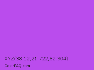 XYZ 38.12,21.722,82.304 Color is a light purple color and the nearest color is Medium Orchid #ba55d3. Hex code #ba4ced and RGB value is rgb(186,76,237). In RGB color space, this color is composed of 73% red, 30% green, 93% blue, In CMYK color space, this color is composed of 22% cyan, 68% magenta, 0% yellow , 7% black , In HSL color space, this color has a hue angle of 281° , 82% saturation and 61% lightness.