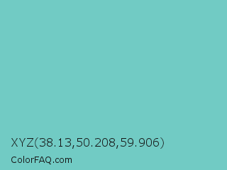 XYZ 38.13,50.208,59.906 Color is a light cyan color and the nearest color is Downy #6fd0c5. Hex code #71cbc4 and RGB value is rgb(113,203,196). In RGB color space, this color is composed of 44% red, 80% green, 77% blue, In CMYK color space, this color is composed of 44% cyan, 0% magenta, 3% yellow , 20% black , In HSL color space, this color has a hue angle of 175° , 46% saturation and 62% lightness.
