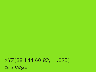 XYZ 38.144,60.82,11.025 Color is a normal green color and the nearest color is Spring Frost #87ff2a. Hex code #88e41f and RGB value is rgb(136,228,31). In RGB color space, this color is composed of 53% red, 89% green, 12% blue, In CMYK color space, this color is composed of 40% cyan, 0% magenta, 86% yellow , 11% black , In HSL color space, this color has a hue angle of 88° , 78% saturation and 51% lightness.