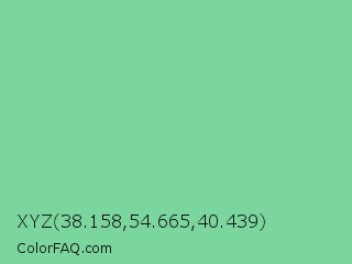 XYZ 38.158,54.665,40.439 Color is a light green color and the nearest color is Medium Aquamarine #66ddaa. Hex code #7ad69d and RGB value is rgb(122,214,157). In RGB color space, this color is composed of 48% red, 84% green, 62% blue, In CMYK color space, this color is composed of 43% cyan, 0% magenta, 27% yellow , 16% black , In HSL color space, this color has a hue angle of 143° , 53% saturation and 66% lightness.