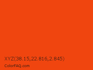 XYZ 38.15,22.816,2.845 Color is a normal red color and the nearest color is Orioles Orange #fb4f14. Hex code #f0450f and RGB value is rgb(240,69,15). In RGB color space, this color is composed of 94% red, 27% green, 6% blue, In CMYK color space, this color is composed of 0% cyan, 71% magenta, 94% yellow , 6% black , In HSL color space, this color has a hue angle of 14° , 88% saturation and 50% lightness.