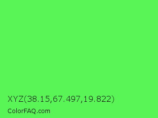 XYZ 38.15,67.497,19.822 Color is a light green color and the nearest color is Screamin Green #66ff66. Hex code #59f456 and RGB value is rgb(89,244,86). In RGB color space, this color is composed of 35% red, 96% green, 34% blue, In CMYK color space, this color is composed of 64% cyan, 0% magenta, 65% yellow , 4% black , In HSL color space, this color has a hue angle of 119° , 88% saturation and 65% lightness.