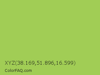 XYZ 38.169,51.896,16.599 Color is a normal green color and the nearest color is Middle Green Yellow #acbf60. Hex code #a1cd55 and RGB value is rgb(161,205,85). In RGB color space, this color is composed of 63% red, 80% green, 33% blue, In CMYK color space, this color is composed of 21% cyan, 0% magenta, 59% yellow , 20% black , In HSL color space, this color has a hue angle of 82° , 55% saturation and 57% lightness.