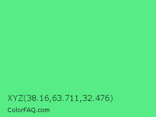 XYZ 38.16,63.711,32.476 Color is a light green color and the nearest color is Very Light Malachite Green #64e986. Hex code #57ec85 and RGB value is rgb(87,236,133). In RGB color space, this color is composed of 34% red, 93% green, 52% blue, In CMYK color space, this color is composed of 63% cyan, 0% magenta, 44% yellow , 7% black , In HSL color space, this color has a hue angle of 139° , 80% saturation and 63% lightness.