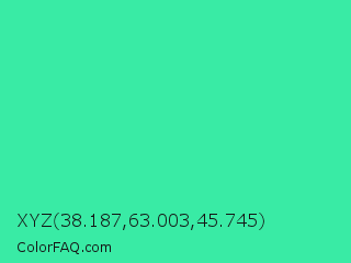 XYZ 38.187,63.003,45.745 Color is a normal green color and the nearest color is Eucalyptus #44d7a8. Hex code #39eba5 and RGB value is rgb(57,235,165). In RGB color space, this color is composed of 22% red, 92% green, 65% blue, In CMYK color space, this color is composed of 76% cyan, 0% magenta, 30% yellow , 8% black , In HSL color space, this color has a hue angle of 156° , 82% saturation and 57% lightness.
