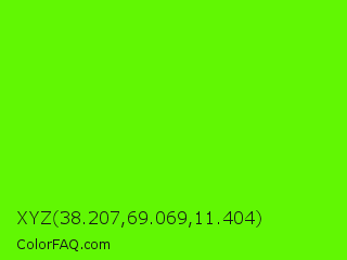 XYZ 38.207,69.069,11.404 Color is a normal green color and the nearest color is Bright Green #66ff00. Hex code #61f703 and RGB value is rgb(97,247,3). In RGB color space, this color is composed of 38% red, 97% green, 1% blue, In CMYK color space, this color is composed of 61% cyan, 0% magenta, 99% yellow , 3% black , In HSL color space, this color has a hue angle of 97° , 98% saturation and 49% lightness.