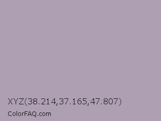 XYZ 38.214,37.165,47.807 Color is a light purple color and the nearest color is Pastel Purple #b39eb5. Hex code #af9fb3 and RGB value is rgb(175,159,179). In RGB color space, this color is composed of 69% red, 62% green, 70% blue, In CMYK color space, this color is composed of 2% cyan, 11% magenta, 0% yellow , 30% black , In HSL color space, this color has a hue angle of 288° , 12% saturation and 66% lightness.