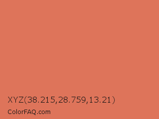 XYZ 38.215,28.759,13.21 Color is a light red color and the nearest color is Terracotta #e2725b. Hex code #de745a and RGB value is rgb(222,116,90). In RGB color space, this color is composed of 87% red, 45% green, 35% blue, In CMYK color space, this color is composed of 0% cyan, 48% magenta, 59% yellow , 13% black , In HSL color space, this color has a hue angle of 12° , 67% saturation and 61% lightness.
