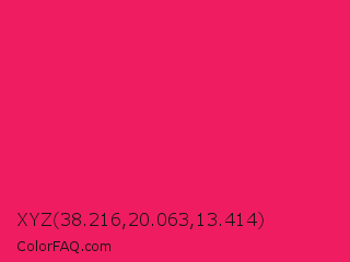 XYZ 38.216,20.063,13.414 Color is a normal rose color and the nearest color is Razzmatazz #e3256b. Hex code #ef1c62 and RGB value is rgb(239,28,98). In RGB color space, this color is composed of 94% red, 11% green, 38% blue, In CMYK color space, this color is composed of 0% cyan, 88% magenta, 59% yellow , 6% black , In HSL color space, this color has a hue angle of 340° , 87% saturation and 52% lightness.