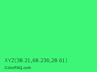 XYZ 38.21,68.236,28.61 Color is a normal green color and the nearest color is UFO Green #3cd070. Hex code #3df677 and RGB value is rgb(61,246,119). In RGB color space, this color is composed of 24% red, 96% green, 47% blue, In CMYK color space, this color is composed of 75% cyan, 0% magenta, 52% yellow , 4% black , In HSL color space, this color has a hue angle of 139° , 91% saturation and 60% lightness.