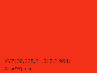 XYZ 38.225,21.317,2.964 Color is a normal red color and the nearest color is Red RYB #fe2712. Hex code #f33118 and RGB value is rgb(243,49,24). In RGB color space, this color is composed of 95% red, 19% green, 9% blue, In CMYK color space, this color is composed of 0% cyan, 80% magenta, 90% yellow , 5% black , In HSL color space, this color has a hue angle of 7° , 90% saturation and 52% lightness.