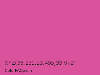 XYZ 38.231,23.495,33.972 Color is a normal rose color and the nearest color is Raspberry Pink #e25098. Hex code #db529c and RGB value is rgb(219,82,156). In RGB color space, this color is composed of 86% red, 32% green, 61% blue, In CMYK color space, this color is composed of 0% cyan, 63% magenta, 29% yellow , 14% black , In HSL color space, this color has a hue angle of 328° , 66% saturation and 59% lightness.
