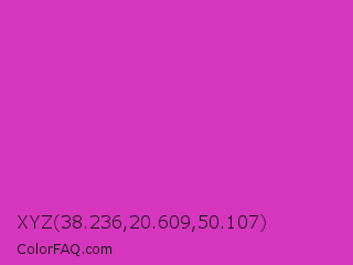 XYZ 38.236,20.609,50.107 Color is a normal magenta color and the nearest color is Steel Pink #cc33cc. Hex code #d636bd and RGB value is rgb(214,54,189). In RGB color space, this color is composed of 84% red, 21% green, 74% blue, In CMYK color space, this color is composed of 0% cyan, 75% magenta, 12% yellow , 16% black , In HSL color space, this color has a hue angle of 309° , 66% saturation and 53% lightness.