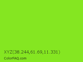 XYZ 38.244,61.69,11.331 Color is a normal green color and the nearest color is Spring Frost #87ff2a. Hex code #85e621 and RGB value is rgb(133,230,33). In RGB color space, this color is composed of 52% red, 90% green, 13% blue, In CMYK color space, this color is composed of 42% cyan, 0% magenta, 86% yellow , 10% black , In HSL color space, this color has a hue angle of 90° , 80% saturation and 52% lightness.