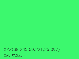 XYZ 38.245,69.221,26.097 Color is a normal green color and the nearest color is UFO Green #3cd070. Hex code #3cf86e and RGB value is rgb(60,248,110). In RGB color space, this color is composed of 24% red, 97% green, 43% blue, In CMYK color space, this color is composed of 76% cyan, 0% magenta, 56% yellow , 3% black , In HSL color space, this color has a hue angle of 136° , 93% saturation and 60% lightness.