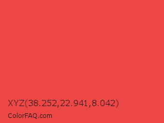 XYZ 38.252,22.941,8.042 Color is a normal red color and the nearest color is Carmine Pink #eb4c42. Hex code #ed4745 and RGB value is rgb(237,71,69). In RGB color space, this color is composed of 93% red, 28% green, 27% blue, In CMYK color space, this color is composed of 0% cyan, 70% magenta, 71% yellow , 7% black , In HSL color space, this color has a hue angle of 1° , 82% saturation and 60% lightness.