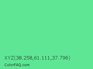 XYZ 38.258,61.111,37.796 Color is a light green color and the nearest color is Very Light Malachite Green #64e986. Hex code #5ee694 and RGB value is rgb(94,230,148). In RGB color space, this color is composed of 37% red, 90% green, 58% blue, In CMYK color space, this color is composed of 59% cyan, 0% magenta, 36% yellow , 10% black , In HSL color space, this color has a hue angle of 144° , 73% saturation and 64% lightness.