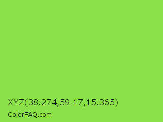 XYZ 38.274,59.17,15.365 Color is a normal green color and the nearest color is Kiwi #8ee53f. Hex code #8ae047 and RGB value is rgb(138,224,71). In RGB color space, this color is composed of 54% red, 88% green, 28% blue, In CMYK color space, this color is composed of 38% cyan, 0% magenta, 68% yellow , 12% black , In HSL color space, this color has a hue angle of 94° , 71% saturation and 58% lightness.