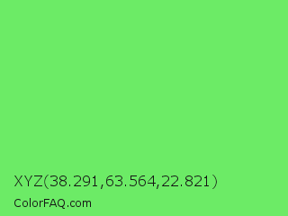 XYZ 38.291,63.564,22.821 Color is a light green color and the nearest color is Screamin Green #66ff66. Hex code #6ceb66 and RGB value is rgb(108,235,102). In RGB color space, this color is composed of 42% red, 92% green, 40% blue, In CMYK color space, this color is composed of 54% cyan, 0% magenta, 57% yellow , 8% black , In HSL color space, this color has a hue angle of 117° , 77% saturation and 66% lightness.
