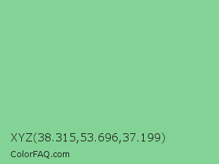 XYZ 38.315,53.696,37.199 Color is a light green color and the nearest color is De York #7ac488. Hex code #84d396 and RGB value is rgb(132,211,150). In RGB color space, this color is composed of 52% red, 83% green, 59% blue, In CMYK color space, this color is composed of 37% cyan, 0% magenta, 29% yellow , 17% black , In HSL color space, this color has a hue angle of 134° , 47% saturation and 67% lightness.