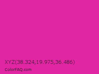 XYZ 38.324,19.975,36.486 Color is a normal magenta color and the nearest color is Frostbite #e936a7. Hex code #e125a3 and RGB value is rgb(225,37,163). In RGB color space, this color is composed of 88% red, 15% green, 64% blue, In CMYK color space, this color is composed of 0% cyan, 84% magenta, 28% yellow , 12% black , In HSL color space, this color has a hue angle of 320° , 76% saturation and 51% lightness.
