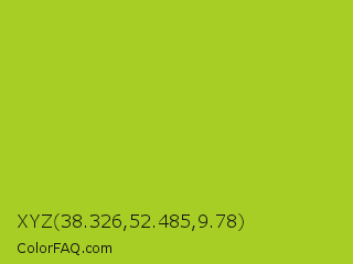 XYZ 38.326,52.485,9.78 Color is a normal lime color and the nearest color is Atlantis #97cd2d. Hex code #a7ce24 and RGB value is rgb(167,206,36). In RGB color space, this color is composed of 65% red, 81% green, 14% blue, In CMYK color space, this color is composed of 19% cyan, 0% magenta, 83% yellow , 19% black , In HSL color space, this color has a hue angle of 74° , 70% saturation and 47% lightness.