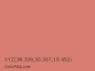 XYZ 38.339,30.307,19.452 Color is a light red color and the nearest color is Japonica #d87c63. Hex code #d77d71 and RGB value is rgb(215,125,113). In RGB color space, this color is composed of 84% red, 49% green, 44% blue, In CMYK color space, this color is composed of 0% cyan, 42% magenta, 47% yellow , 16% black , In HSL color space, this color has a hue angle of 7° , 56% saturation and 64% lightness.
