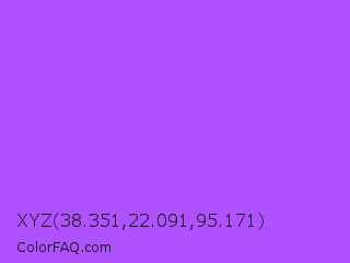 XYZ 38.351,22.091,95.171 Color is a light purple color and the nearest color is Navy Purple #9457eb. Hex code #af51fd and RGB value is rgb(175,81,253). In RGB color space, this color is composed of 69% red, 32% green, 99% blue, In CMYK color space, this color is composed of 31% cyan, 68% magenta, 0% yellow , 1% black , In HSL color space, this color has a hue angle of 273° , 98% saturation and 65% lightness.