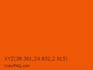 XYZ 38.361,24.832,2.915 Color is a normal orange color and the nearest color is Persimmon #ec5800. Hex code #ed5705 and RGB value is rgb(237,87,5). In RGB color space, this color is composed of 93% red, 34% green, 2% blue, In CMYK color space, this color is composed of 0% cyan, 63% magenta, 98% yellow , 7% black , In HSL color space, this color has a hue angle of 21° , 96% saturation and 47% lightness.