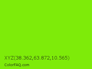 XYZ 38.362,63.872,10.565 Color is a normal green color and the nearest color is Alien Armpit #84de02. Hex code #7eeb09 and RGB value is rgb(126,235,9). In RGB color space, this color is composed of 49% red, 92% green, 4% blue, In CMYK color space, this color is composed of 46% cyan, 0% magenta, 96% yellow , 8% black , In HSL color space, this color has a hue angle of 89° , 93% saturation and 48% lightness.