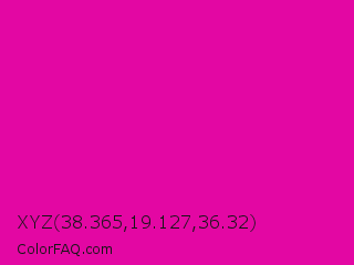 XYZ 38.365,19.127,36.32 Color is a normal magenta color and the nearest color is Hollywood Cerise #f400a1. Hex code #e307a3 and RGB value is rgb(227,7,163). In RGB color space, this color is composed of 89% red, 3% green, 64% blue, In CMYK color space, this color is composed of 0% cyan, 97% magenta, 28% yellow , 11% black , In HSL color space, this color has a hue angle of 317° , 94% saturation and 46% lightness.