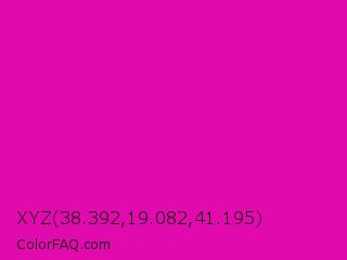 XYZ 38.392,19.082,41.195 Color is a normal magenta color and the nearest color is Hollywood Cerise #f400a1. Hex code #e00aad and RGB value is rgb(224,10,173). In RGB color space, this color is composed of 88% red, 4% green, 68% blue, In CMYK color space, this color is composed of 0% cyan, 96% magenta, 23% yellow , 12% black , In HSL color space, this color has a hue angle of 314° , 91% saturation and 46% lightness.
