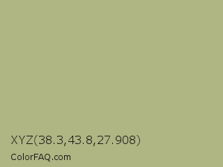 XYZ 38.3,43.8,27.908 Color is a light yellow color and the nearest color is Swamp Green #acb78e. Hex code #afb583 and RGB value is rgb(175,181,131). In RGB color space, this color is composed of 69% red, 71% green, 51% blue, In CMYK color space, this color is composed of 3% cyan, 0% magenta, 28% yellow , 29% black , In HSL color space, this color has a hue angle of 67° , 25% saturation and 61% lightness.
