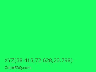 XYZ 38.413,72.628,23.798 Color is a normal green color and the nearest color is Spring Green #00ff7f. Hex code #19ff63 and RGB value is rgb(25,255,99). In RGB color space, this color is composed of 10% red, 100% green, 39% blue, In CMYK color space, this color is composed of 90% cyan, 0% magenta, 61% yellow , 0% black , In HSL color space, this color has a hue angle of 139° , 100% saturation and 55% lightness.
