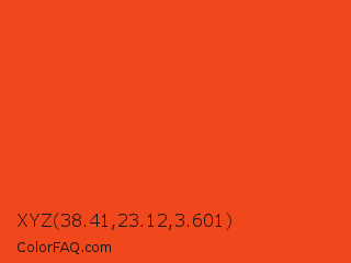 XYZ 38.41,23.12,3.601 Color is a normal red color and the nearest color is Pomegranate #f34723. Hex code #f0471d and RGB value is rgb(240,71,29). In RGB color space, this color is composed of 94% red, 28% green, 11% blue, In CMYK color space, this color is composed of 0% cyan, 70% magenta, 88% yellow , 6% black , In HSL color space, this color has a hue angle of 12° , 88% saturation and 53% lightness.