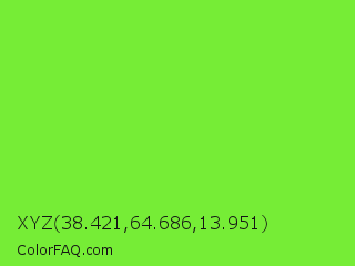XYZ 38.421,64.686,13.951 Color is a normal green color and the nearest color is Kiwi #8ee53f. Hex code #76ed36 and RGB value is rgb(118,237,54). In RGB color space, this color is composed of 46% red, 93% green, 21% blue, In CMYK color space, this color is composed of 50% cyan, 0% magenta, 77% yellow , 7% black , In HSL color space, this color has a hue angle of 99° , 84% saturation and 57% lightness.