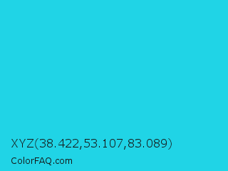XYZ 38.422,53.107,83.089 Color is a normal cyan color and the nearest color is Scooter #2ebfd4. Hex code #20d4e6 and RGB value is rgb(32,212,230). In RGB color space, this color is composed of 13% red, 83% green, 90% blue, In CMYK color space, this color is composed of 86% cyan, 8% magenta, 0% yellow , 10% black , In HSL color space, this color has a hue angle of 185° , 80% saturation and 51% lightness.